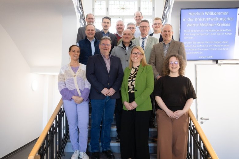 Beim gemeinsamen Erörterungstermin zur geplanten interkommunalen Zusammenarbeit zur Einrichtung einer Zentralen Vergabestelle kamen Vertreterinnen und Vertreter des Werra-Meißner-Kreises sowie der kreisangehörigen Kommunen zusammen. Im Bild von links nach rechts: Patricia Hölzel (Stadträtin, Stadt Eschwege), Marko Heckerodt (Bürgermeister, Gemeinde Ringgau), Landrätin Nicole Rathgeber, Carolin Gisselmann (Bürgermeisterin, Gemeinde Herleshausen), Thomas Mäurer (Bürgermeister, Gemeinde Weißenborn), Volker Mosler (Hessisches Ministerium des Innern, für Sicherheit und Heimatschutz), Frank Koch (Bürgermeister, Stadt Waldkappel), Olaf Templin (Bürgermeister, Gemeinde Meinhard), Finn Thomsen (Bürgermeister, Stadt Großalmerode), Daniel Schulze (Leitung Bauamt, Stadt Waldkappel), Markus Munk (Büroleiter, Stadt Waldkappel), Marcus Stolle (Bürgermeister, Gemeinde Neu-Eichenberg), Dr. Lutz Bergner (Bürgermeister, Gemeinde Berkatal) und Thilo Vogt (Bürgermeister, Stadt Wanfried).